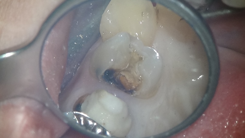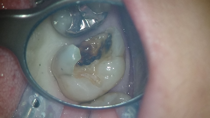 Q. 根管治療でマイクロスコープさえ使えば高い成功率になりますか?A. いいえ、なりません金属のつめものの隙間から虫歯が広がっています金属を外して虫歯を染めてみると、こんな感じ濃い緑…